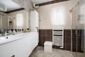 La salle d’eau, rénovée récemment (moins de 3 ans), offre une surface de 5,12 m² avec une ambiance actuelle et soignée. Les WC, séparés, mesurent 1,12 m² et ont été refaits également, avec un WC suspendu et un espace entièrement carrelé.