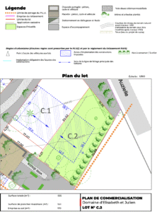 Lot C1 : 554 m² – Surface plancher maximale : 150 m² – Emprise au sol : 170 m² – Prix : 178 900 € FAI